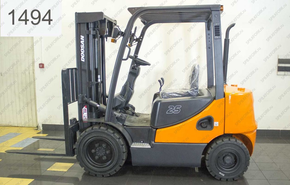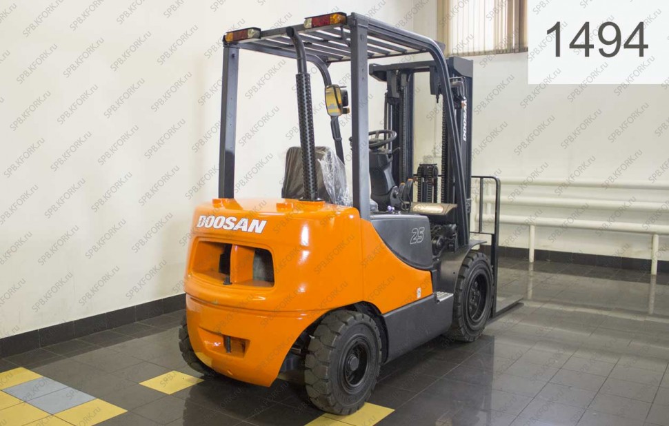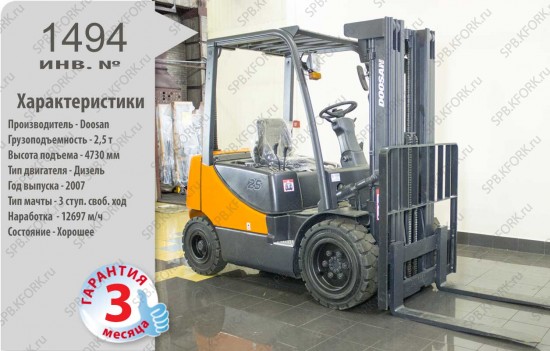 Дизельный автопогрузчик Doosan Б/У с интентарным номером 1494 2007 года выпуска. Состояние - Хорошее. Имеет грузоподъемность 2500 кг. Гарантия: 3 мес или 500 м/час.
