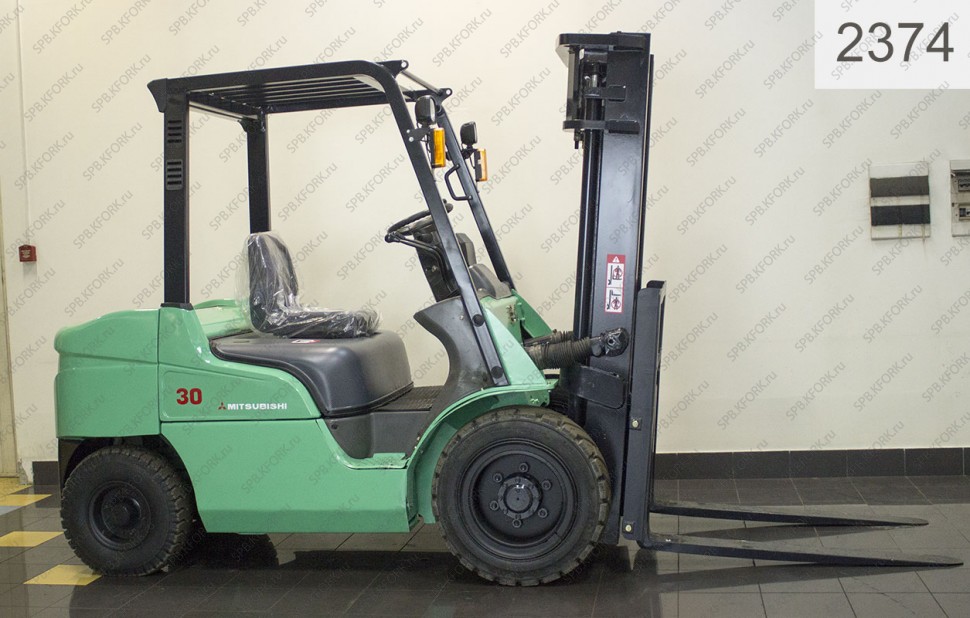Дизельный автопогрузчик Mitsubishi Б/У с интентарным номером 2374 2008 года выпуска. Состояние - Хорошее. Имеет грузоподъемность 3000 кг. Гарантия: 3 мес или 500 м/час.
