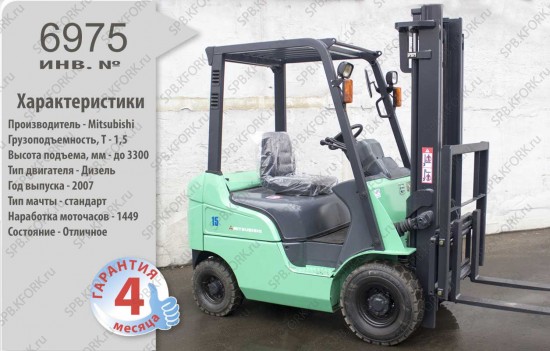 Дизельный автопогрузчик Mitsubishi Б/У с интентарным номером 6975 2007 года выпуска. Состояние - Хорошее. Имеет грузоподъемность 1500 кг. Гарантия: 4 мес или 500 м/час.