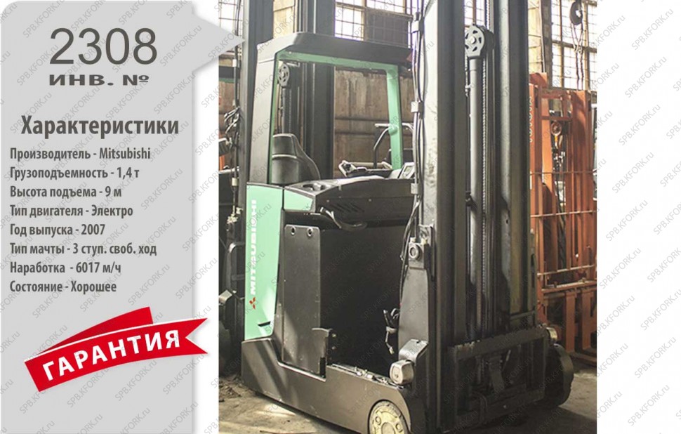 Электрический Ричтрак Mitsubishi Б/У с интентарным номером 2308 2007 года выпуска. Состояние - Хорошее. Имеет грузоподъемность 1400 кг. Гарантия: 1 мес или 200 м/час.